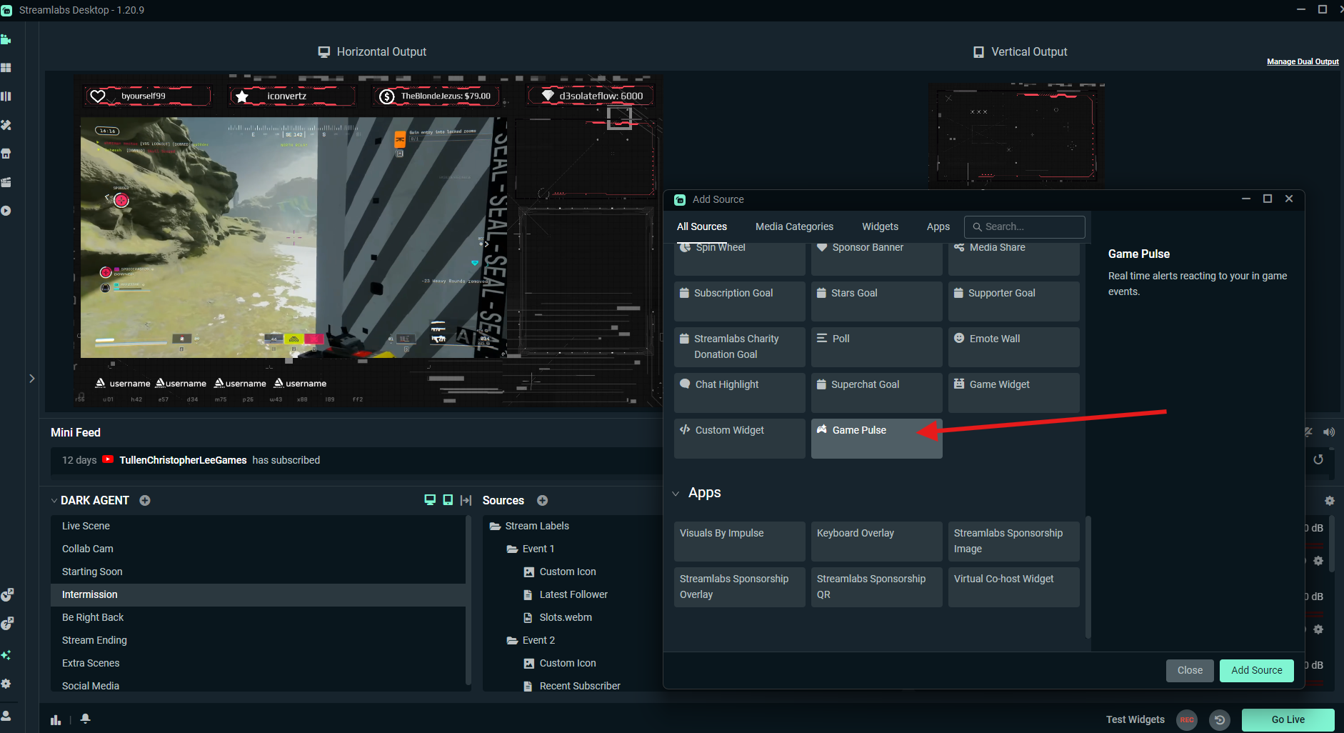 Click the + Icon next to Sources and select Game Pulse Widget from the Widgets/Apps list.