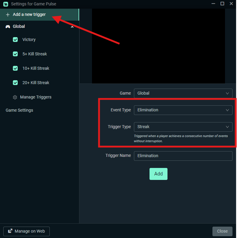You can click Add a new trigger on the top left and create your very own reaction to in-game events under Event Type and Trigger Type, such as Victory Streak, Defeat, Eliminations and more.