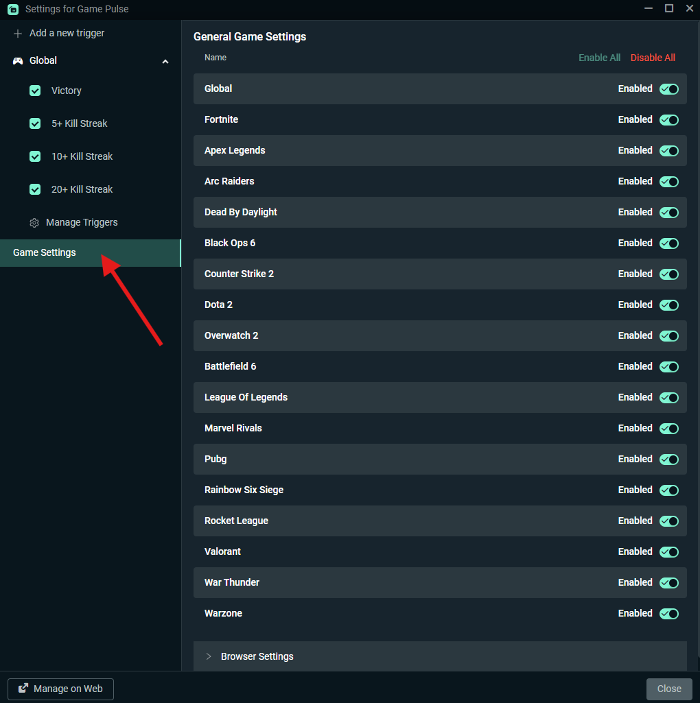 Open Game Settings to choose which games can trigger your Game Pulse animations. Toggle each game on or off to match your stream’s vibe. For example, you can keep electric, cartoony Victory animations for Fortnite while running clean sci-fi HUD effects for Valorant.
