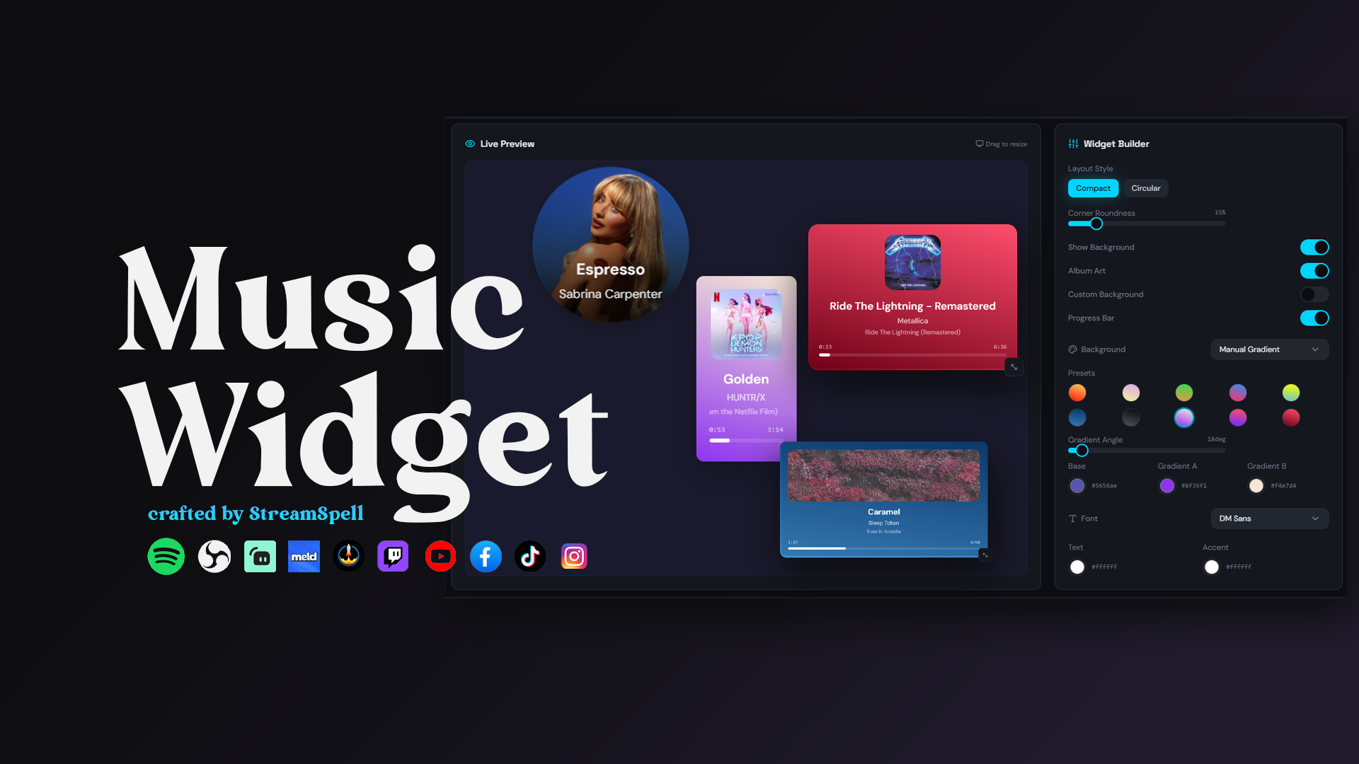Create a custom Spotify widget for your stream with now-playing visuals, flexible styling, and browser-source support for OBS, Streamlabs, and more.